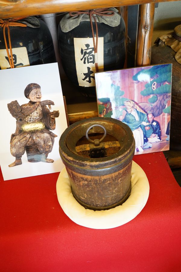 第七代目通圓は、アニメ「一休さん」でお馴染みの一休和尚と深交があり、一休和尚から「初代通円」の木像を賜ります。写真は、豊臣秀吉が千利休に作らせたという釣瓶。この釣瓶を使い、第十一代目通圓は、宇治川の三の間から茶会用の水を汲んだそう。
