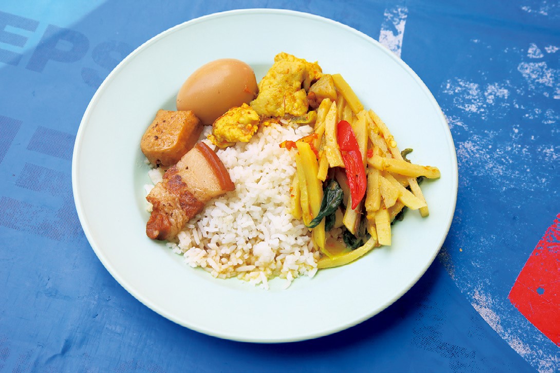 カオ・カー・ムー(B60)は、ご飯に甘辛く煮込んだ豚角煮をのせたご飯メニュー。味付け玉子や野菜も3種までトッピングできるんです!