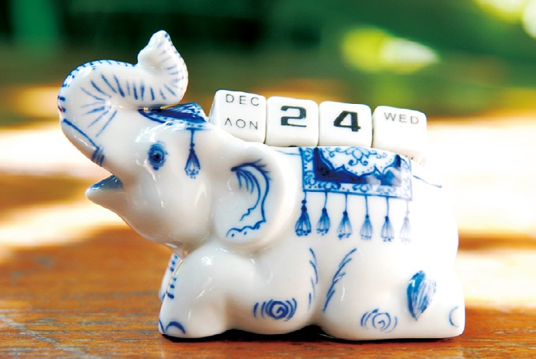 チェンマイなどの食器や布小物のほか、ビーズや半貴石で作る手作りの上質なアクセサリーも人気のショップ。2階はタイ料理レストランになっているので、ショッピングもグルメも楽しめます!写真のアイテムは、象の万年カレンダー(B290)。月・日・曜日を自由に替えられます。