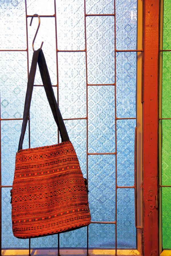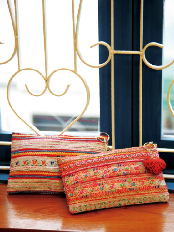 オーナーの山根さん夫妻がデザイン&セレクトした雑貨が人気のショップです。伝統技と天然素材を融合したモダンな食器やバッグ、アクセサリーなどが揃っています。写真はモン族の貴重な古布で作った一点物のポーチ(各B330)。