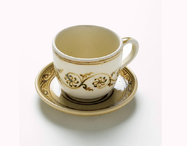火山灰を混ぜて作ったタイ北部産のカロン焼のカップ&ソーサー(B550)はレトロでかわいい柄&デザイン。
