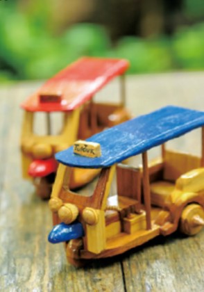 チーク材を用いた木彫りのトゥクトゥク(小B480、大B580)はタイらしさ満点!インテリアにぴったりです。