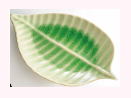 やわらかい色合いがかわいい、葉っぱの形をしたセラドン焼の皿はB140でゲットできます。
