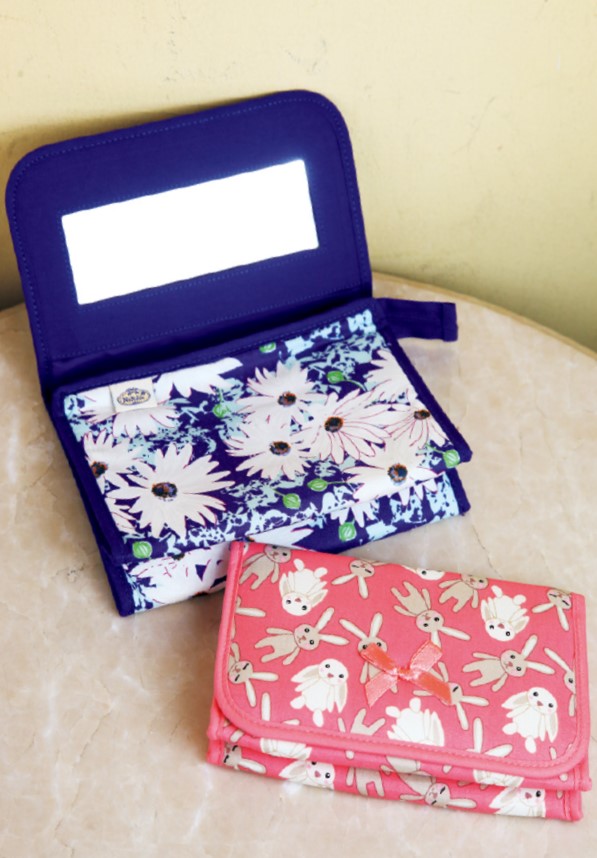 1989年創業のこちらの老舗は、コットン、デニム、サテンなどさまざまな布で作るバッグや小物はデザインもサイズもバラエティ豊か!フタ部分にミラーが付いたポーチ(各B110)はマチつきなので収納力も◎!