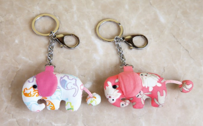 バッグの飾りとしても使える象がモチーフのキーチェーン(各B130)も布で作られたやわらかい雰囲気です。