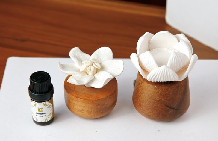 硬質クレイ製の花の中心にアロマオイルをたらして使うアロマ・フラワー・デコレーション(各B630)は、オリジナリティにあふれており、インテリアにしてもかわいいんです!
