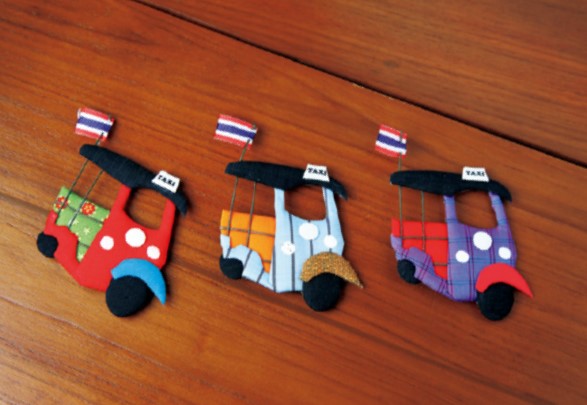 バンコクでおなじみの乗り物、トゥクトゥクの布製マグネット(各B100)はお手頃価格でおみやげにも最適です。