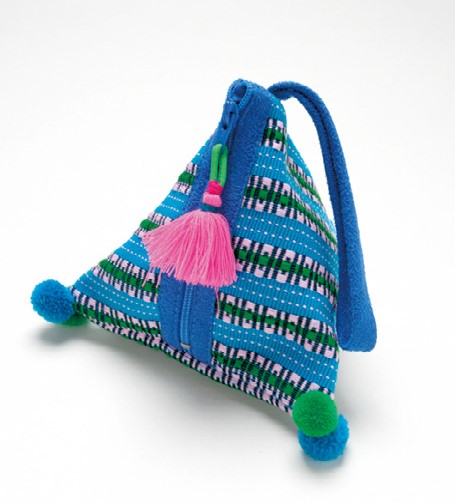 「ロフティ・バンブー」は、タイ山岳民族の手作り布製品の人気店。ポーチやバッグなどは色柄からデザインまですべてオリジナルなんです!ブレスレット(B270)などのアクセサリーも要チェック!写真はタイ北部に住むカレン族の手織りの布を使ったポーチ(各B240)です。