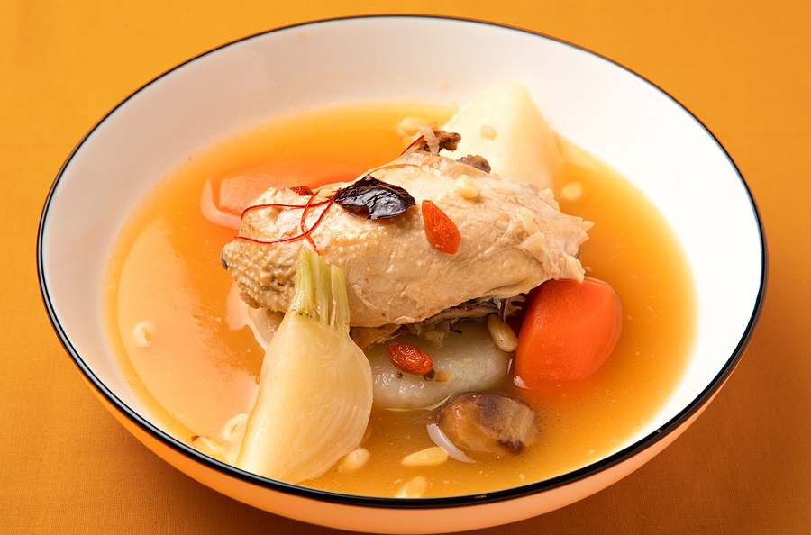 韓国の代表的な料理として知られるのが、ひな鶏の中にもち米や高麗人参、ナツメなどを入れて煮込んだ「参鶏湯(サムゲタン)」。今回は大根餅をいっしょに煮込み、「大根もち入りサムポト!~ごろごろ野菜のサムゲタンポトフ~」(1280円)としてポトフ風に仕上げています。旨みがギュッとつまったスープが滋味深く、お腹も満足の一品です。