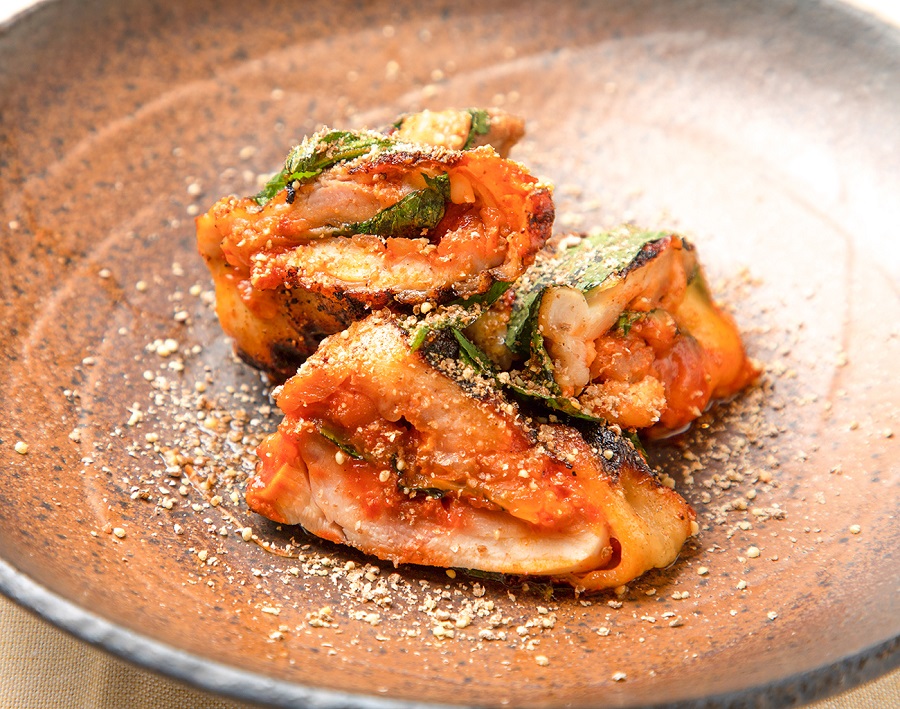 韓国の食卓ではよく使われるエゴマの葉を使用した「鶏肉チーズのエゴマ巻き~コチュジャンソース和え~」(880円)。コチュジャンに漬けこんだ鶏肉に、チーズを挟んだ濃厚な味わい。エゴマの葉が持つ独特の香ばしさがアクセントとして効いています。
