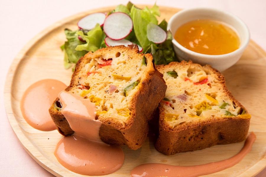 輸入パプリカの約8割が韓国産という日本。最先端技術で丁寧に生産された新鮮なパプリカをふんだんに使ったのが「パプリカとエホバクのふんわりあまあまケークサレ」(680円)。パプリカとの相性もバツグンの「エホバク」(韓国産かぼちゃ)といっしょに生地に練りこみ、焼き上げました。オーロラソースとゆずジャムでいただきます。