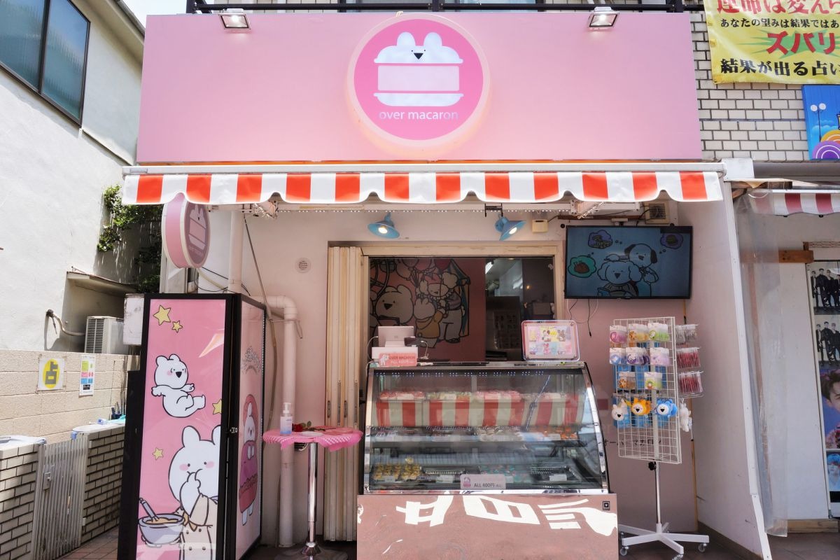 かわいいピンク色のお店「over macaron」は日本と韓国で大ブームになったキャラクター「すこぶる動くウサギ(Over Action Rabbit)」の専門店です。