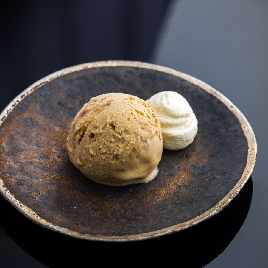 氷の中に隠されているのは、アーモンドプラリネアイスと塩キャラメルホイップ。2つの味が層となり、より一層、かき氷をゴージャススイーツに昇華させます。