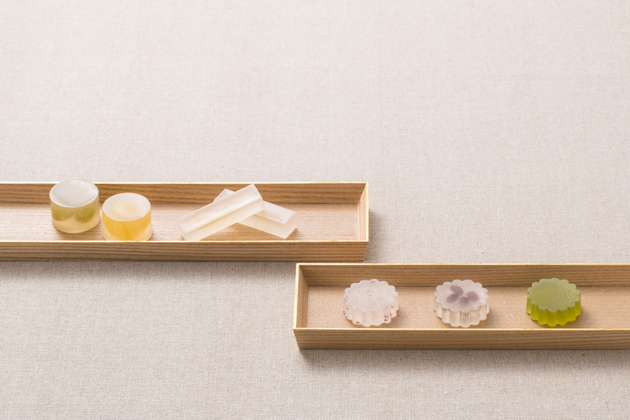 琥珀は、職人の熟練の技術で乾燥させることで、表面はシャリッと、中は寒天の柔らかさが残った繊細なあじわいに仕上げてあります。定番の柚子こごり、春はえんどう豆、夏は豆、秋は栗など種類もいろいろ。