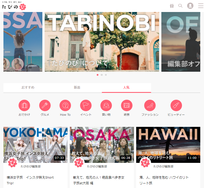 旅とおでかけの動画投稿サイト「たびのび」は、昨年12月にオープンしたばかりの「るるぶ&more.」姉妹サイト!旅好きのユーザーが集まり、旅のアイデアや思い出、ライフスタイルを動画として投稿し、シェアできる新感覚のサイトです。