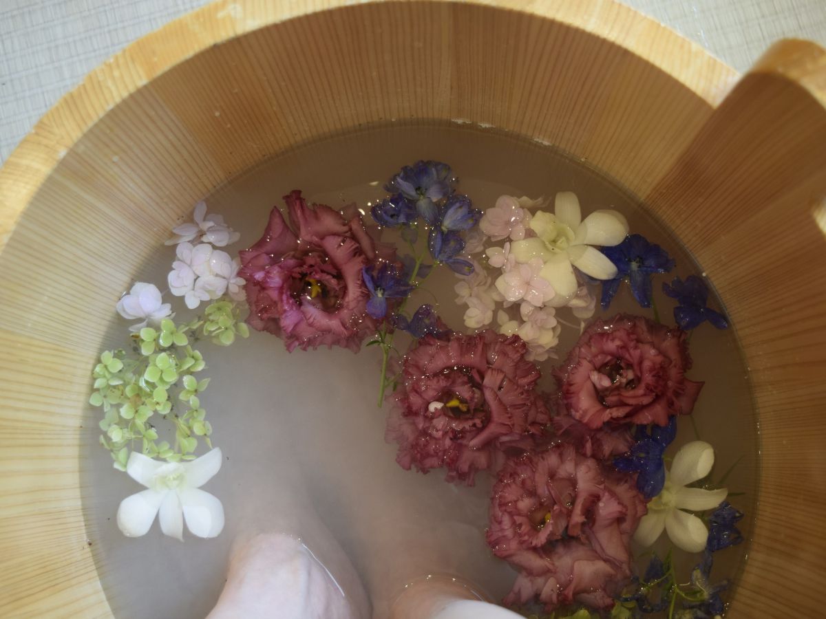 お花の足湯は、まるで花束の中に足を入れるような豪華さ、色鮮やかな組み合わせにテンションが上がります。その時季の花が使われるので、夏はヒマワリのようなビタミンカラーが中心。秋はコスモスをベースにいろどりのよい花や緑を加えます。