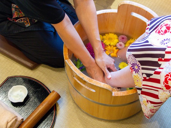 緑茶エキスが配合された緑茶の足湯は、リラックス効果が抜群。ふくいくたる緑茶の香りに、アタマの中がからっぽになって、非日常を味わえます。 もうひとつのメニュー、塩の足湯は日本文化に興味をもつ外国人に大人気。足湯という日本の文化と塩による浄化、ということでわざわざやってくる人が多いようです。塩は体が温まることでも知られているし、禊効果でいろんなものをデトックスできるかもしれませんね。