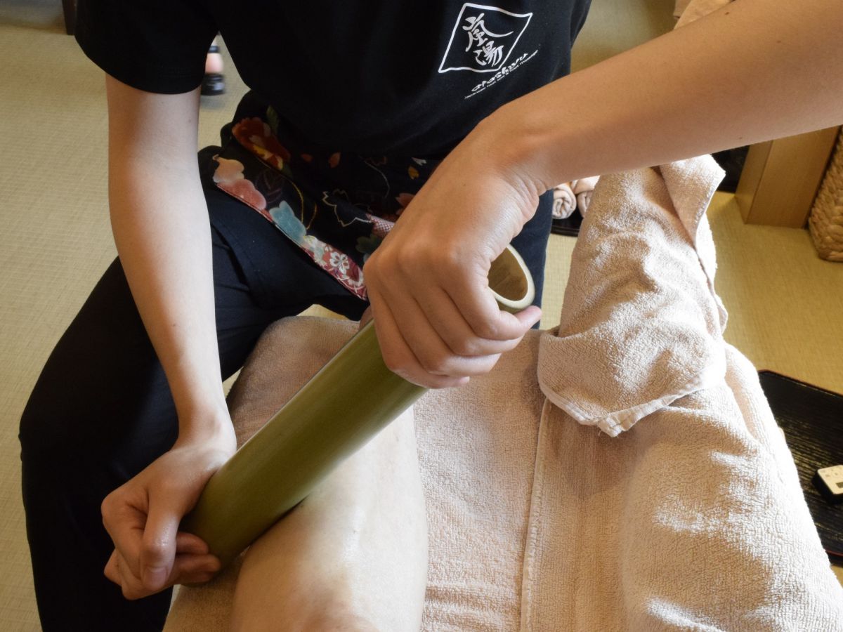 仕上げは嵐山店だけのサービスとして、青竹でふくらはぎや足裏をマッサージ。これもまた心地よくて、眠ってしまう人が多いようです。観光で歩き過ぎたときにぴったりですね。