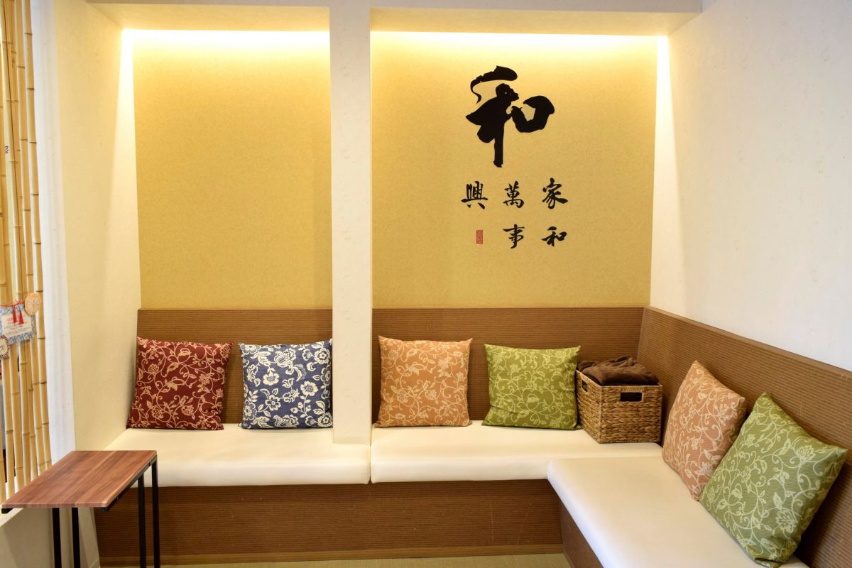 受付のマネージャーにあえてマスクを外してもらって写真をパチリ。靴を脱いで店内にあがり、足湯のメニューを見ると、期待感が高まります。