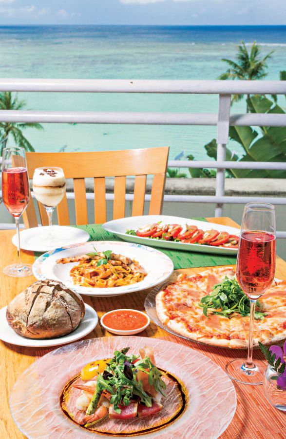 ホテル4階にあるイタリア料理店「プレゴ」。タモン湾を見渡せるテラスは、ヤシの木も見えて南国感満点です!