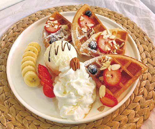 アイスとフレッシュフルーツがのった人気のワッフルはW1万5000。見た目もカラフルでかわいく、食欲をそそります。話題の空間で、甘いスイーツタイムをどうぞ♡