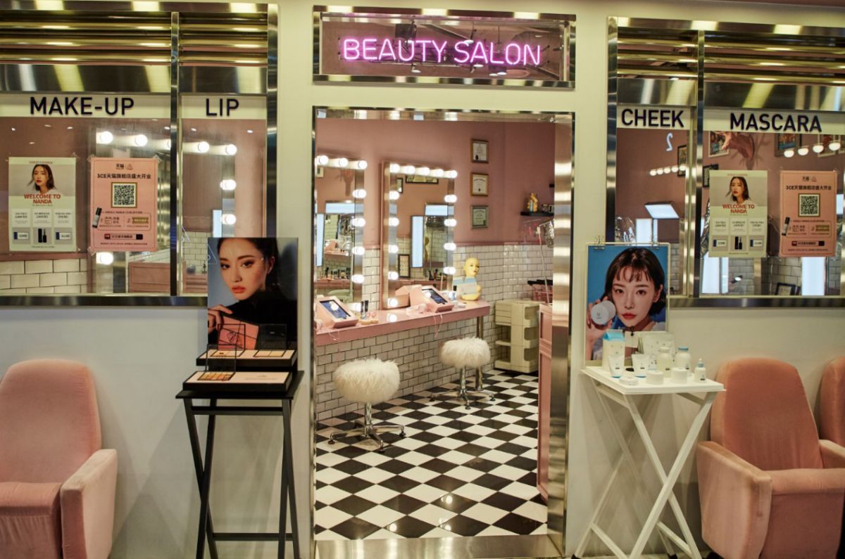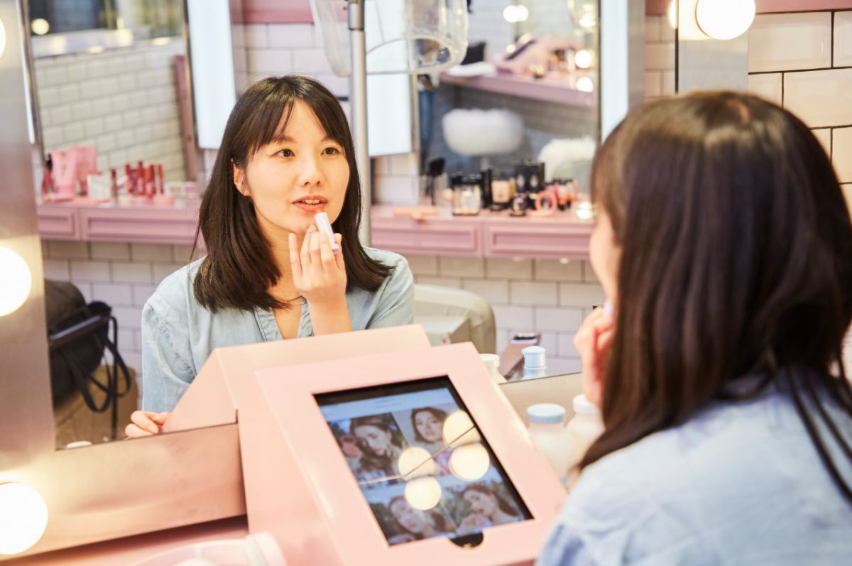 明洞や弘大にも店舗があり、どこもフォトジェニックな店内が魅力的ですが、こちらのカロスキルの店舗では、地下でメイクのお試しができるのが話題!まるでモデルさんのメイク室のようなきらきら美しい空間で、気になるアイテムを使ってみて、発色や肌なじみなどをチェックできます。女優ライトに照らされて、なんだかいつもよりかわいく見える気がしてきます!