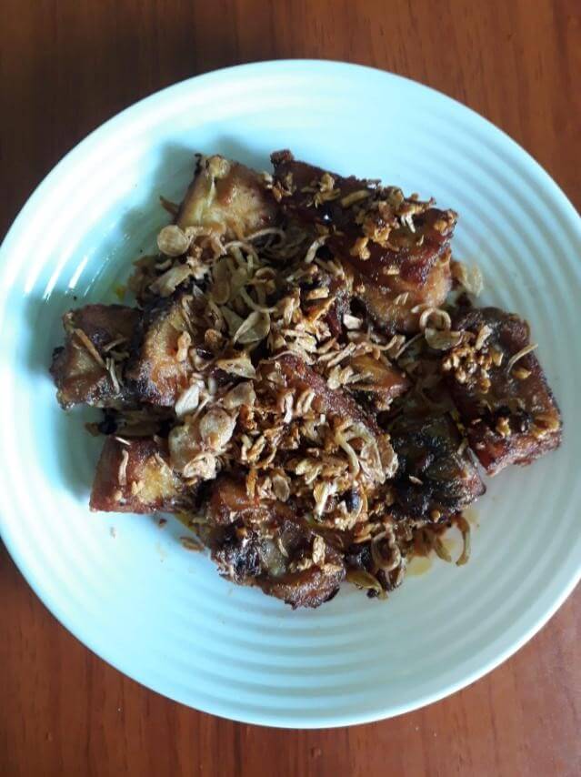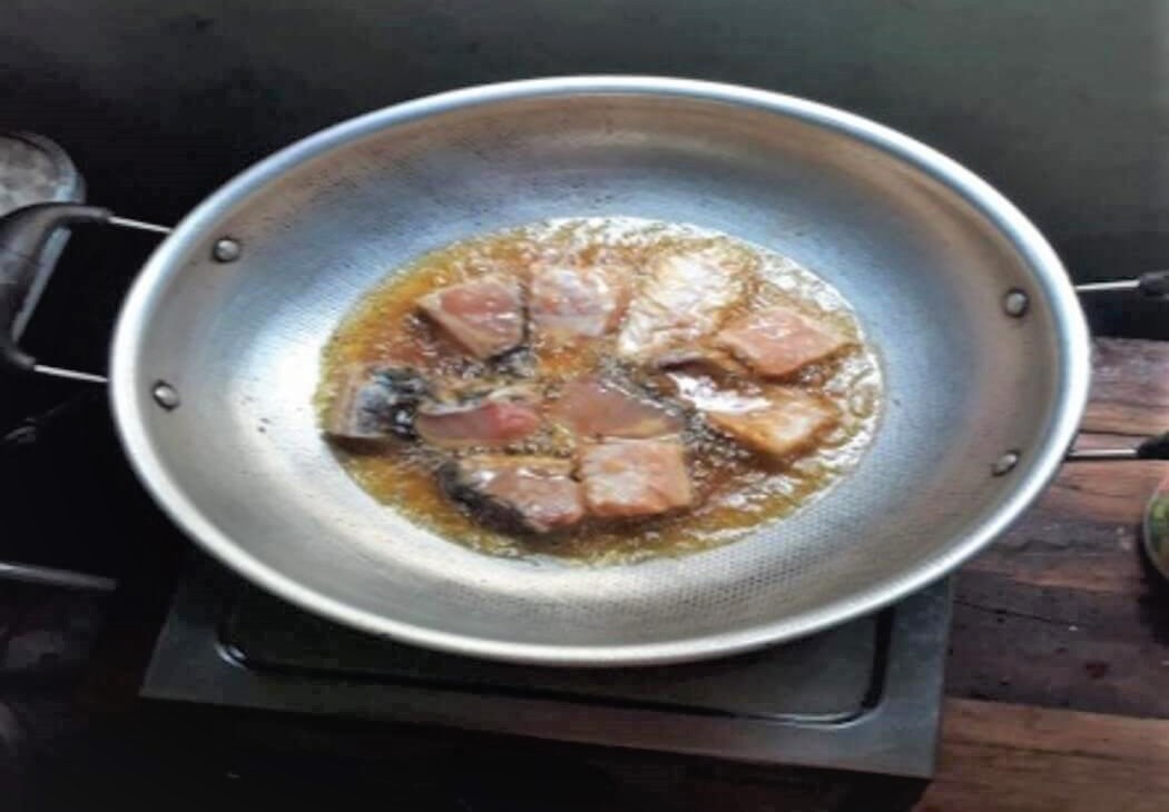 4.にんにく、玉ねぎ、生姜がキツネ色になったら、鯉の頭を入れ10分間よく混ぜながら炒めます。