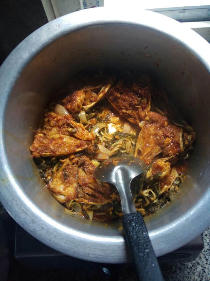 6.ローゼル葉が柔らかくなったら、フライパンで炒めた鯉の頭と水1.5リットルを入れ沸騰するまで煮込みます。