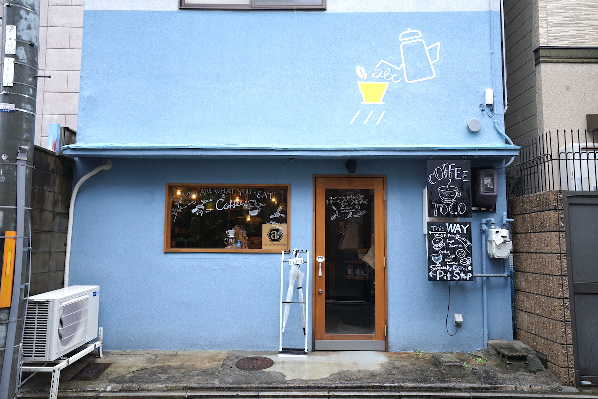 「alt. coffee rosters」は、京都市営地下鉄「二条城前駅」から徒歩約10分にあるコーヒーロースター。スカイブルーに彩られた外壁がパッと目を引き、写真に撮りたくなるかわいらしさです。
