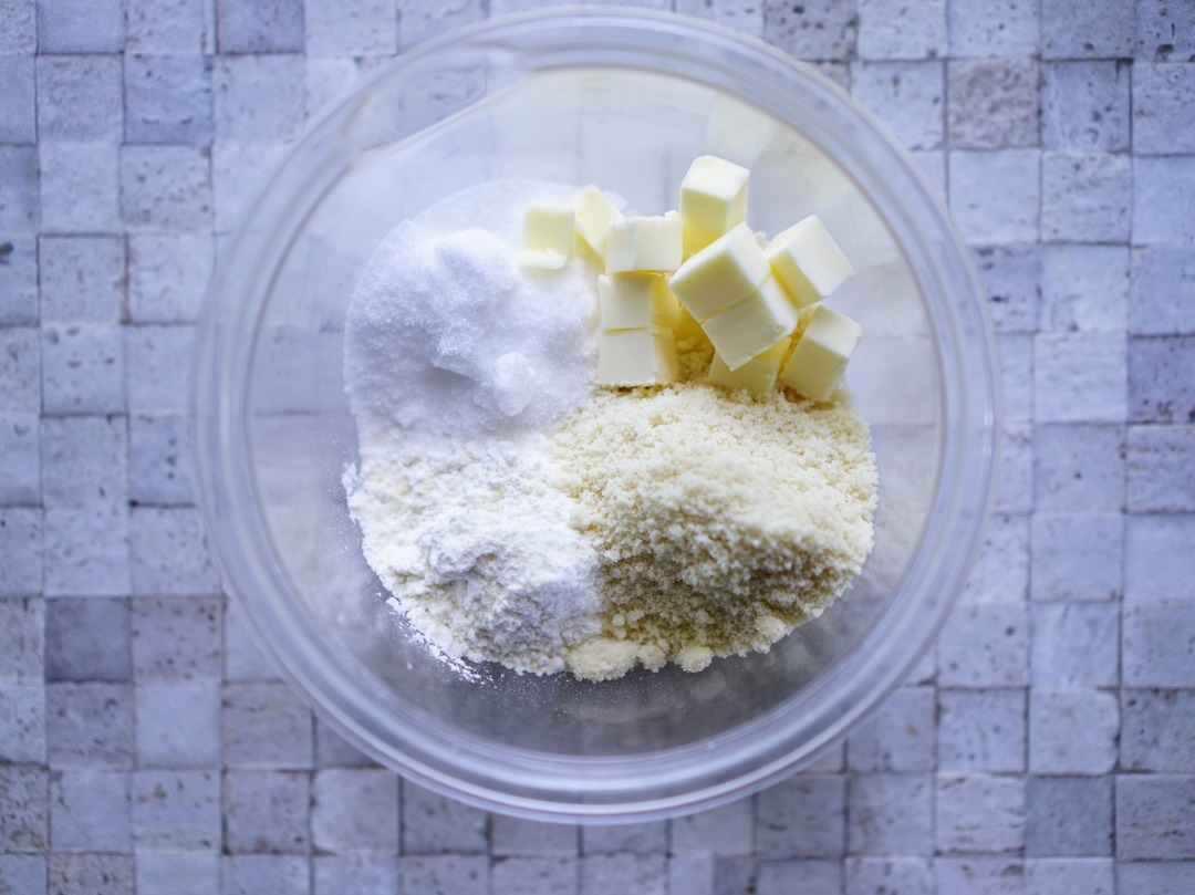 クランブルの材料をボウルに入れて、ゴムべらでざっと混ぜます。(バターは冷えたものを使ってください)