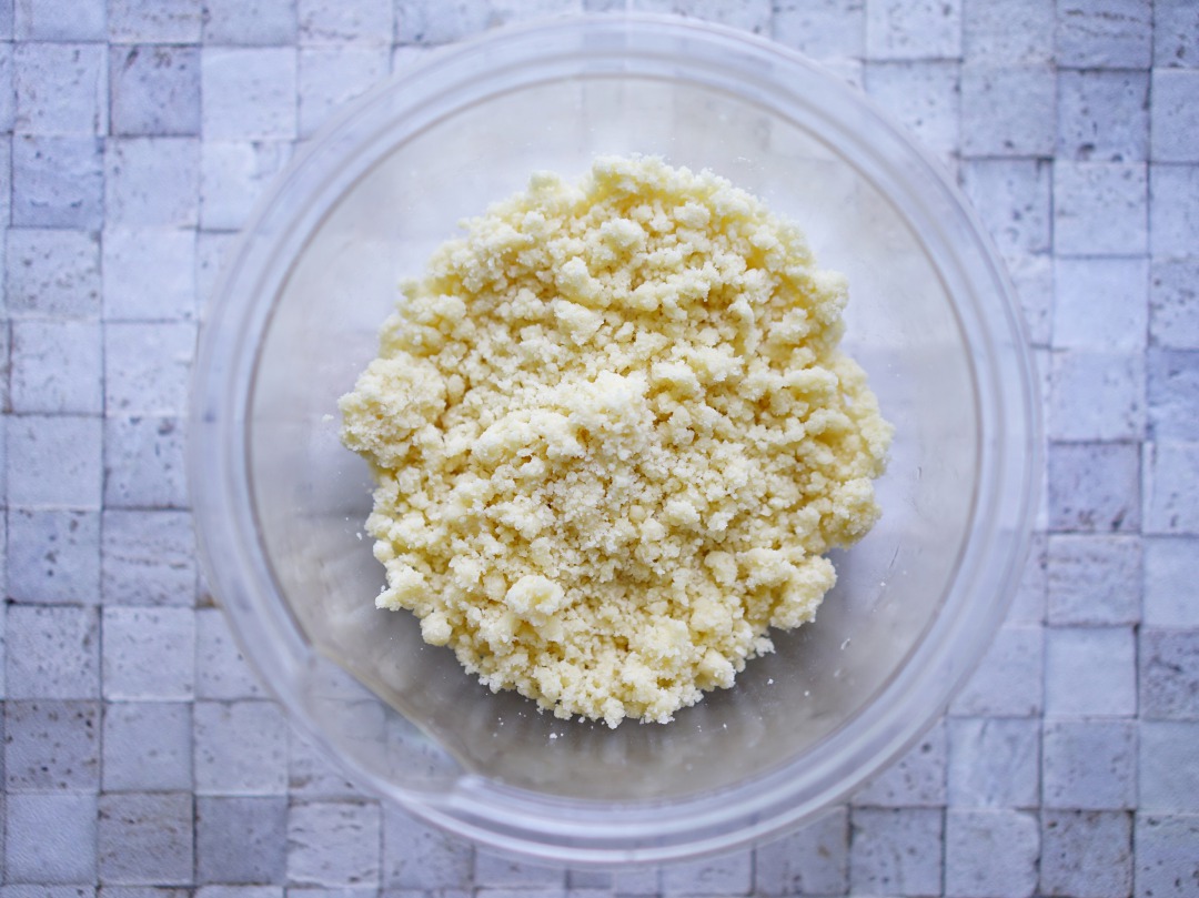 だいたい混ざったら、バターを指でほぐしながらなじませていきます。このぐらいぽろぽろになったらできあがり。