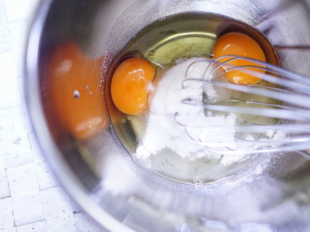 ボウルに卵とグラニュー糖を入れ、白っぽくなるまで泡立て器で泡立てます。