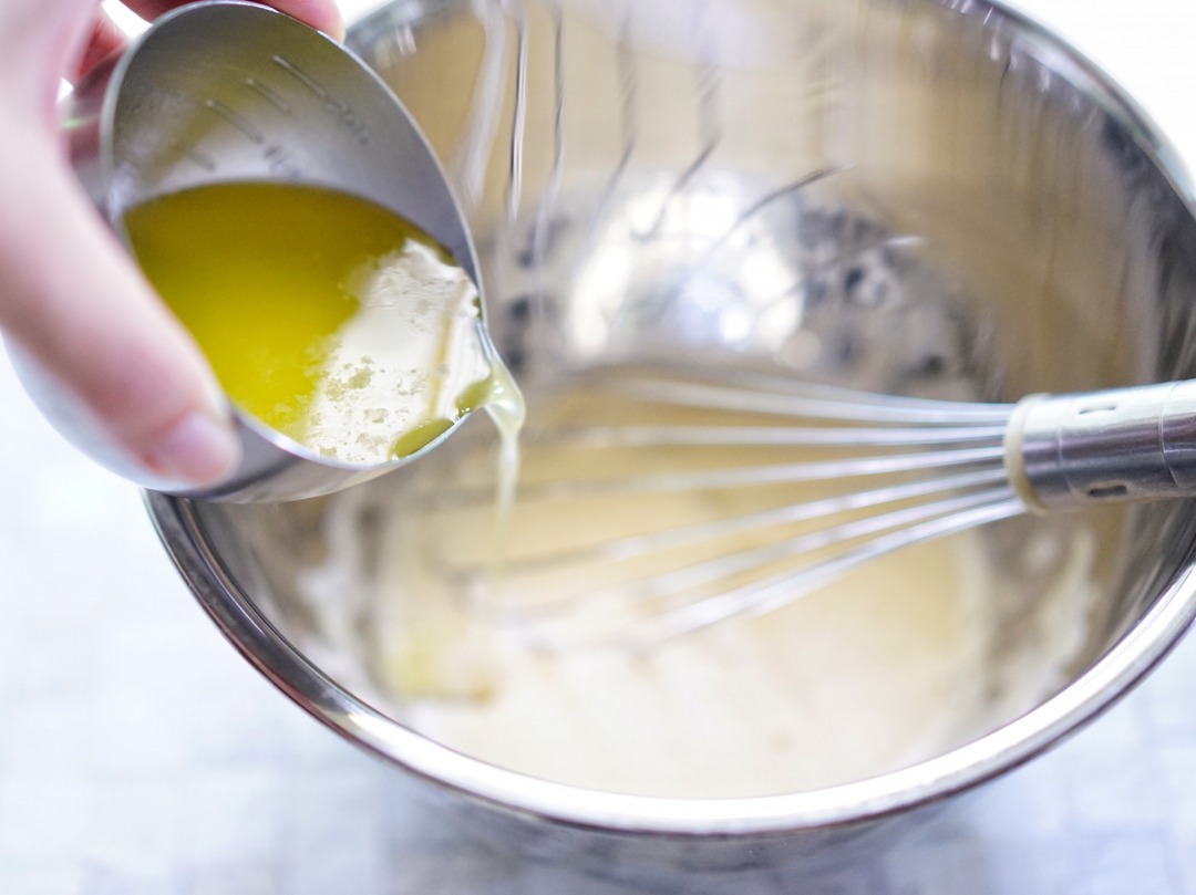 オイルとバターを加えて、底からぐるぐるとむらなく混ぜます。