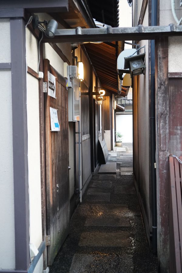 建物の間に、人ひとり歩けるほどの石畳をみつけたら、そこが「祇園楽宴小路」への入り口。