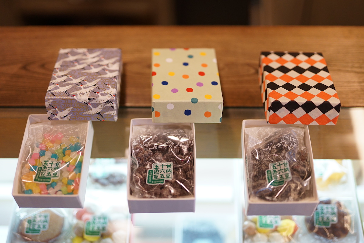 そんな十六五でおみやげとして人気なのが、かわいらしい箱にお菓子を詰めたこちらの一品。こんぺいとうと五色豆がそれぞれ別々の箱に入っており、2箱1セットになっています。色とりどりの千代紙箱が2つ連なる姿がなんともかわいい!