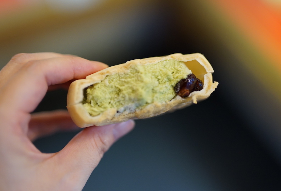 最中に抹茶アイスと十六五オリジナルの大納言小豆を入れ込んだ「抹茶アイス最中」も美味! クリーミーで爽やかな抹茶アイスと、甘さ控えめの上品な大納言小豆が絶妙にマッチし、パリパリの最中とも相まってクセになるおいしさです。