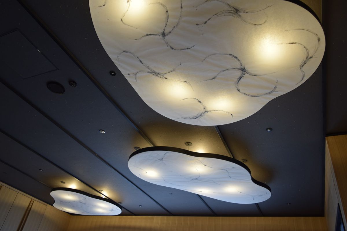 ソファーに座って天井を見上げると、不思議な形の照明。ふわふわと漂う雲をイメージさせる作家・清原遥氏の作品なのです。