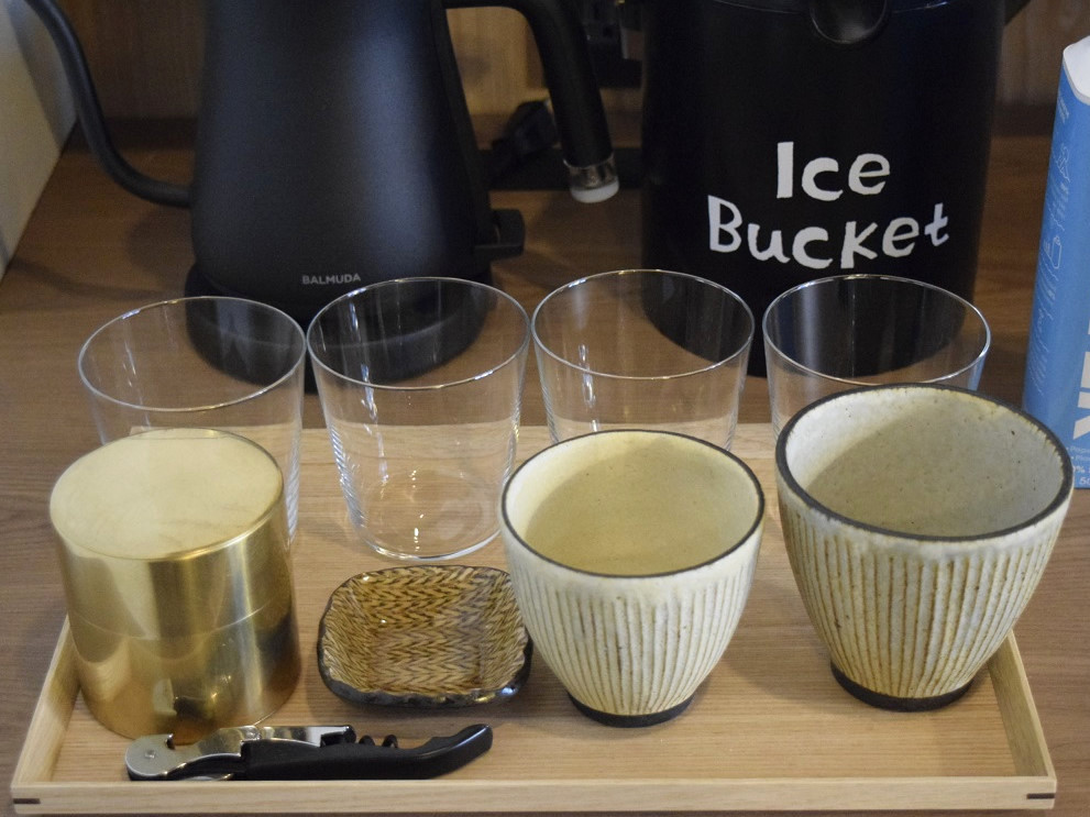 ミニバーに設置されているカップ類、鎬(しのぎ)模様の湯呑は笠間焼・額賀章夫氏、スリップウェアの小皿は益子焼・伊藤丈浩氏の作品です。現代の作家が作る日本の伝統工芸品が使われているのも魅力です。