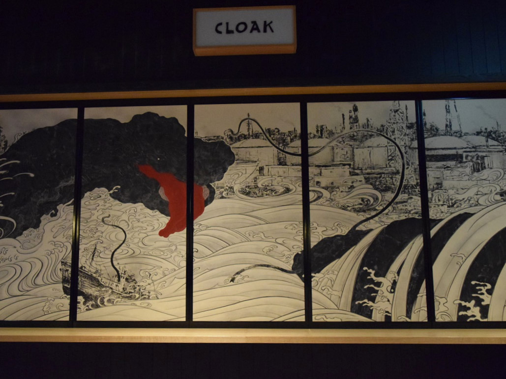 宴会場があるフロアのクロークも閉まっている状態で、こんなにダイナミックな絵が描かれていました。丹羽優太(Yuta Niwa)氏の作品です。