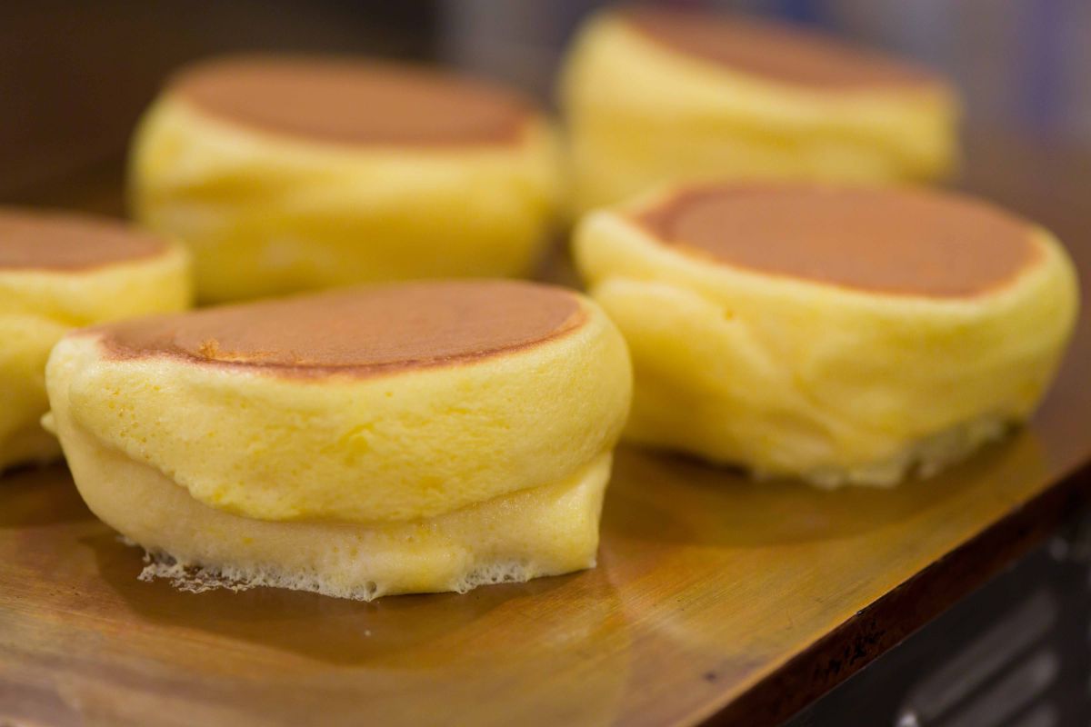 銅板で1枚ずつ丁寧に焼き上げます。膨張剤を使用していないにもかかわらず、20分ほどじっくり時間をかけて焼き上げるので、ふわっふわのパンケーキが実現!
