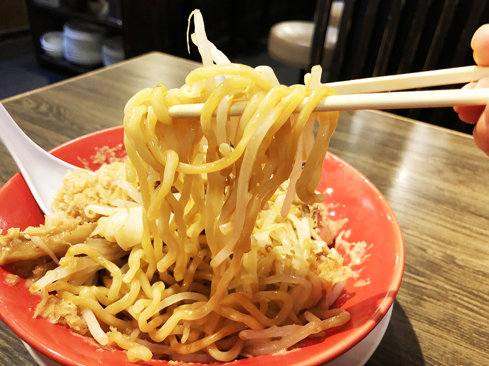 太めの麺やシャキシャキのモヤシが出てきました。かき氷のスープとよく混ぜていただきます。