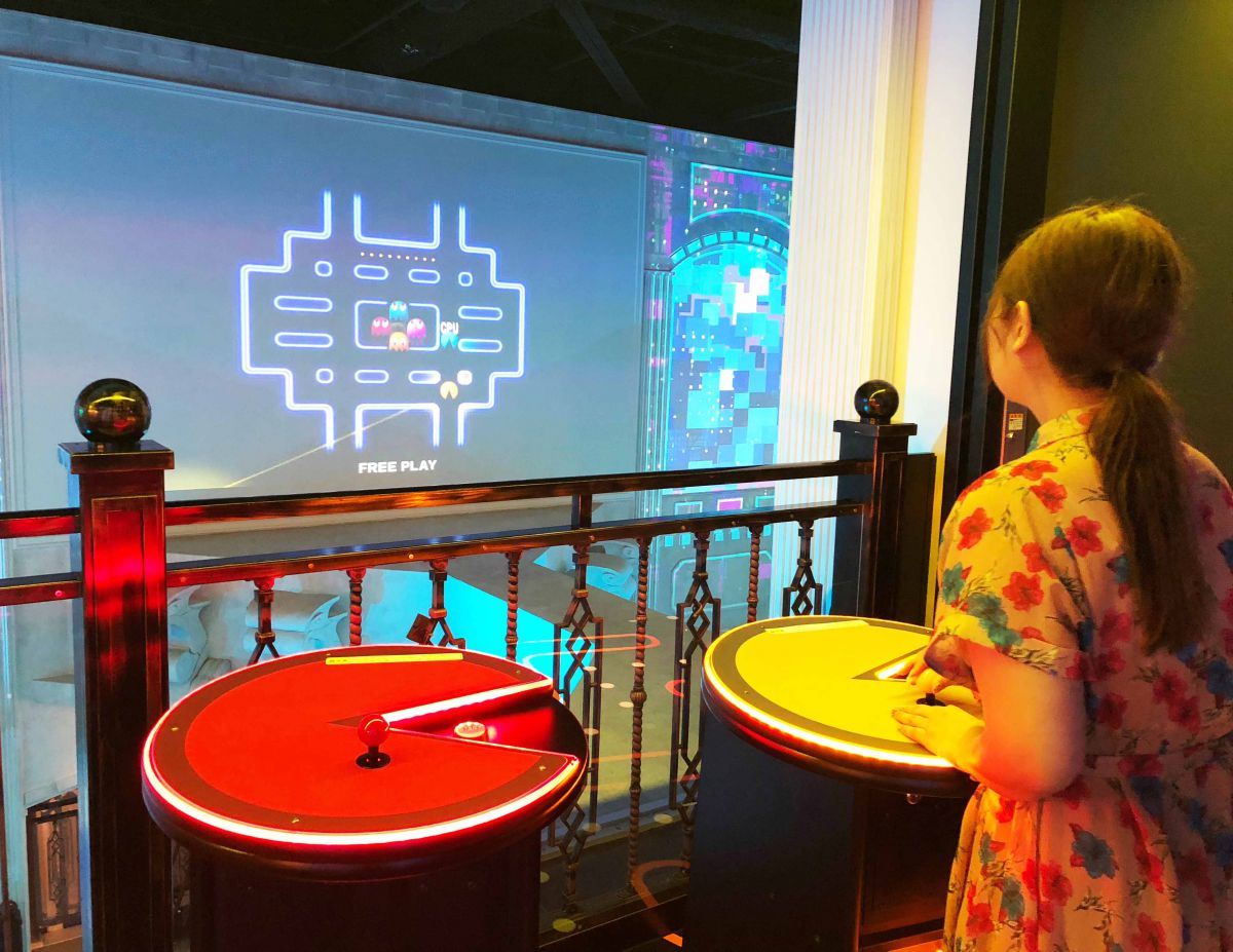 こちらは通路に設置されている『パックマンバトルロイヤル』。レバーでパックマンを操作して、壁のスクリーンに映る迷路の中のクッキーを食べ尽くしていきます。