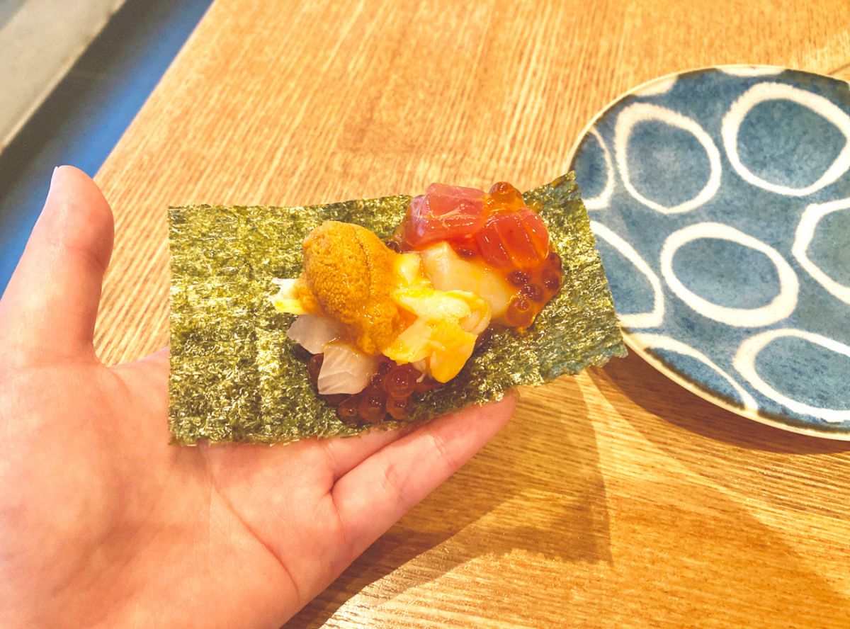 海鮮と一緒に盛りつけられた卵黄を割り、付属の海苔に具材を巻いていただきます。味 は言わずともご想像いただけると思いますが、まさに玉手箱とはこのこと!しっかり新鮮で天国気分でした。