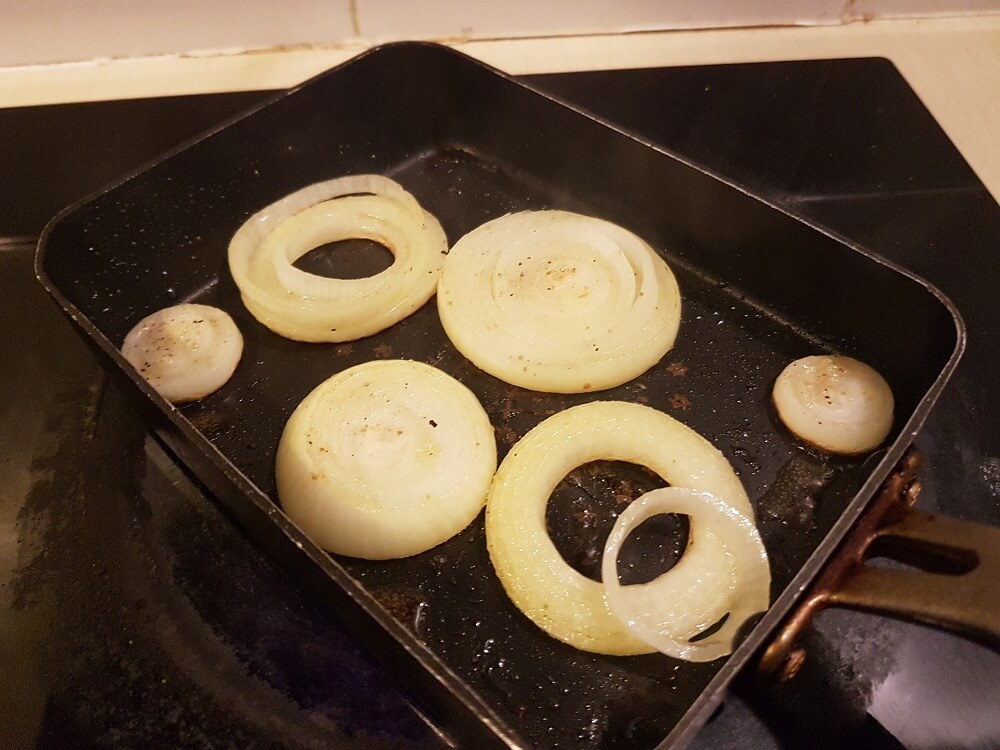 4.スライスしたタマネギとマッシュルームをフライパンで炒め、塩コショウ少々で味をつける
