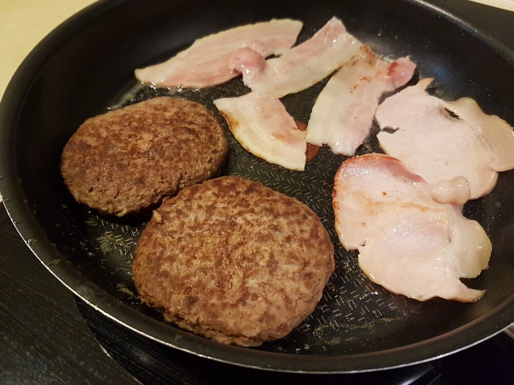 3.パテを焼いているフライパンで、ベーコンも一緒に焼く