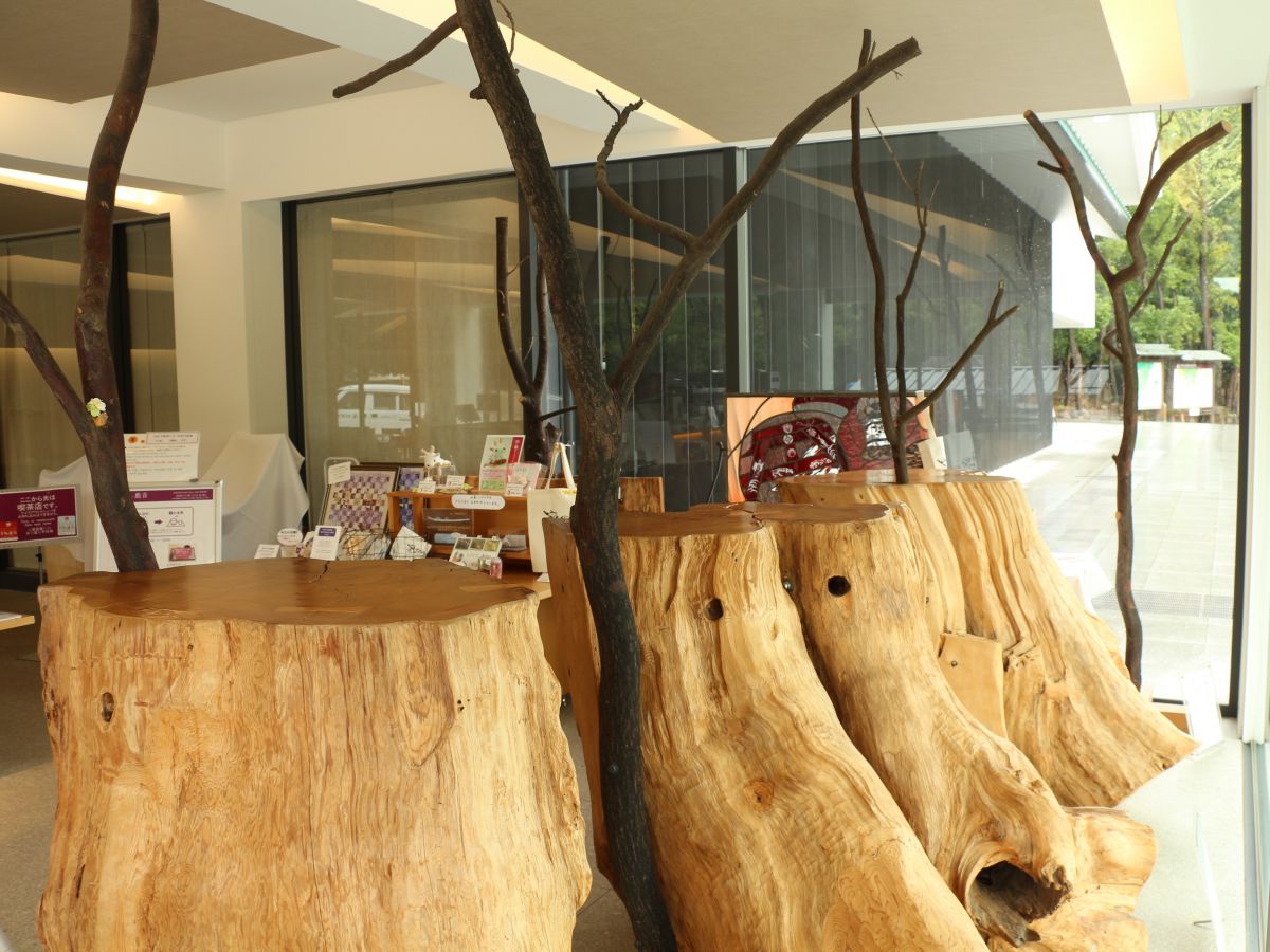 店内に入るとすぐ、存在感のある大きな切り株が目に入ります。これは樹齢800年の春日大杉の切り株。旧宝物殿に保管していた三笠山の杉の木で、昭和初期に落雷があった木の切り株です。国宝館のリニューアルにあわせて磨き上げ、カウンターテーブルとしてカフェ&ショップに登場しました。