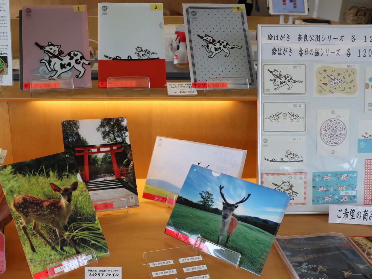 ショップは春日大社国宝殿のミュージアムショップも兼ねていて、オリジナルグッズやお菓子などを取り揃えています。国宝殿のオープン時にラインナップした猫モチーフの文様がキュートなグッズが人気です。ポストカードやクリアファイル、マスキングテープ、トートバッグ、手ぬぐいなどがそろっています。
