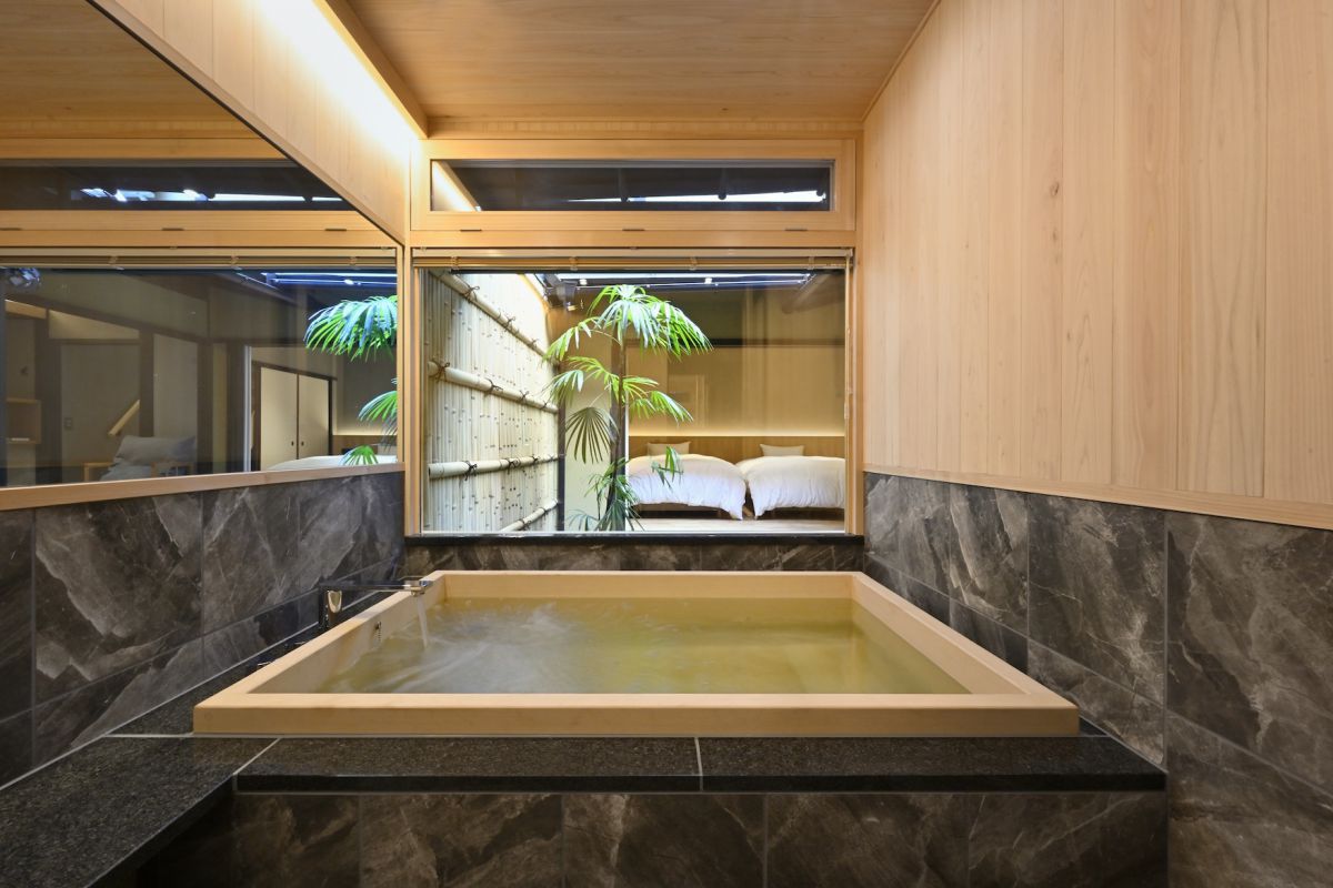 1階には坪庭を囲んで、お風呂・洗面・トイレといった水回り、ベッドルームとライブラリーを完備。2階はキッチン、ダイニング、和室とトイレがあり、旅のひとときで京都暮らし気分を味わえます。