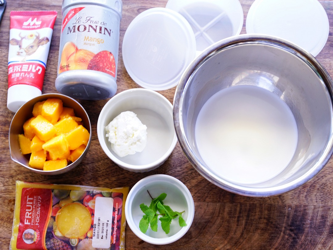 | 牛乳…300g コンデンスミルク…30g マンゴーピューレ…100g ☆ マンゴー…1個 ☆ マンゴーソース…適量 ☆ コンデンスミルク…適量 ☆ バニラアイス…適量 ☆ ミント…適量 |