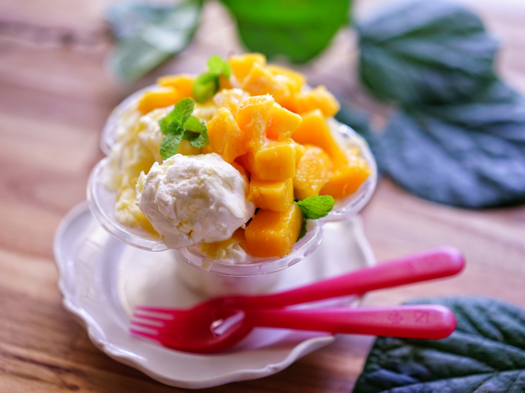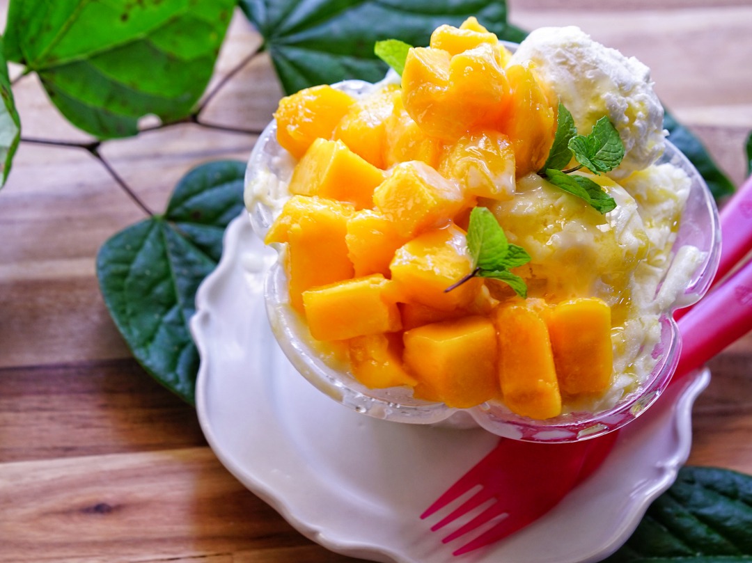 カットしたマンゴー、アイスクリームをのせ、(あれば)マンゴーソース、コンデンスミルクをかけて、ミントを飾れば完成です。